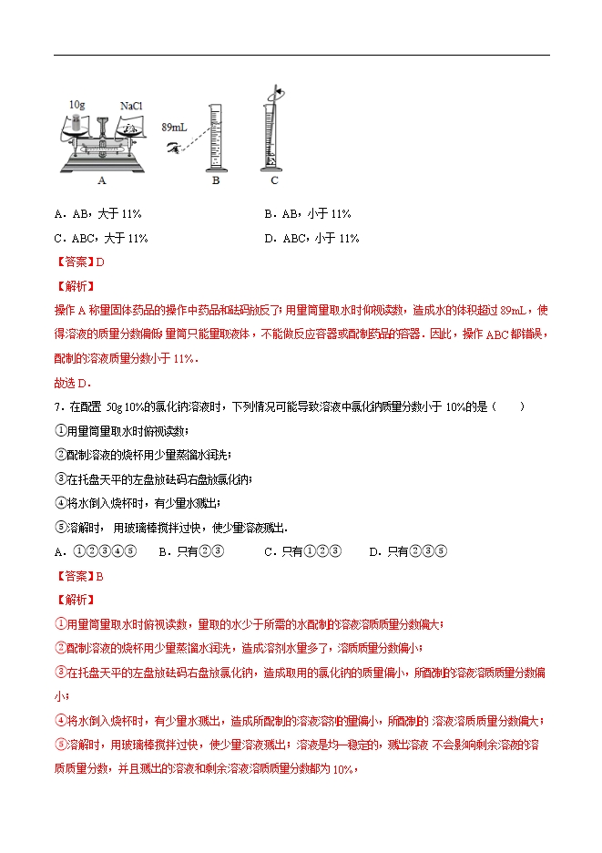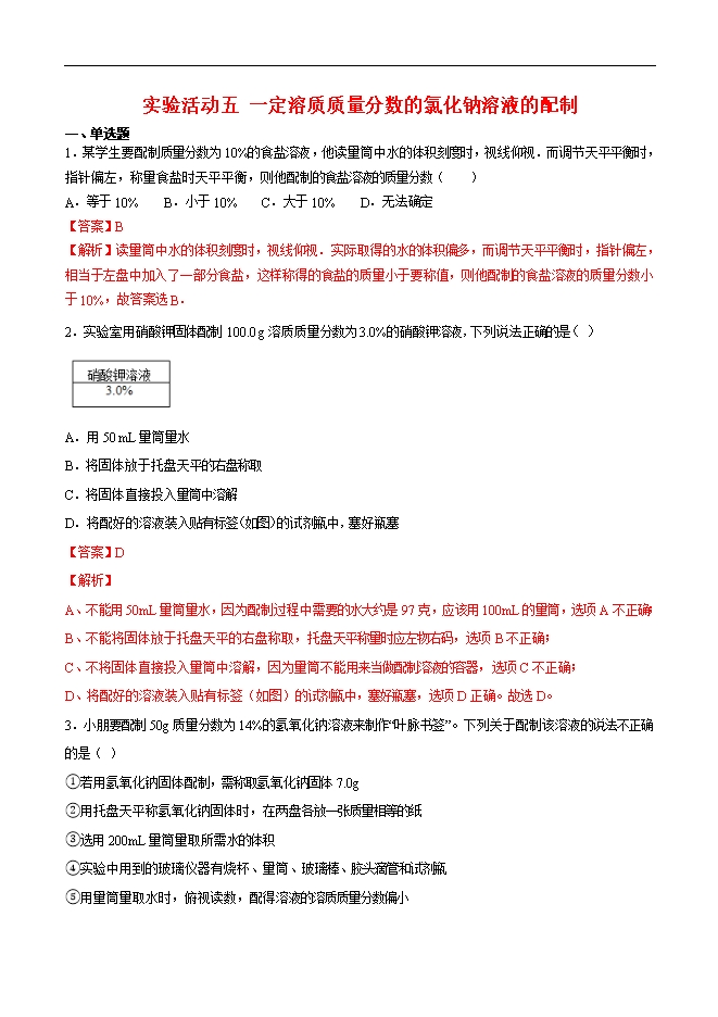 2019-2020学年人教版九年级化学下册《课题9.4实验活动五 一定溶质质量分数的氯化钠溶液的配制》同步练习(解析版)