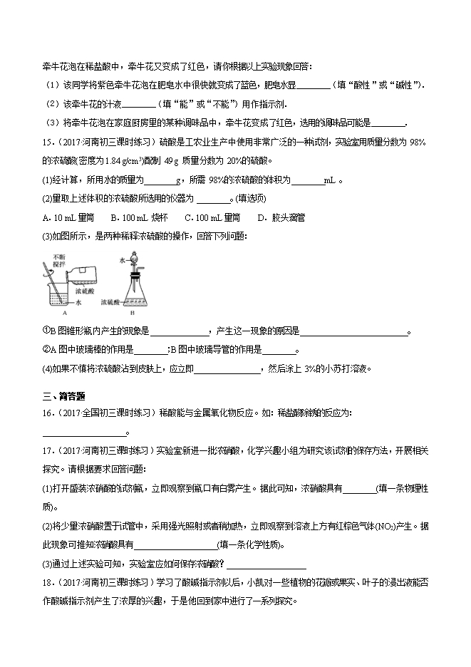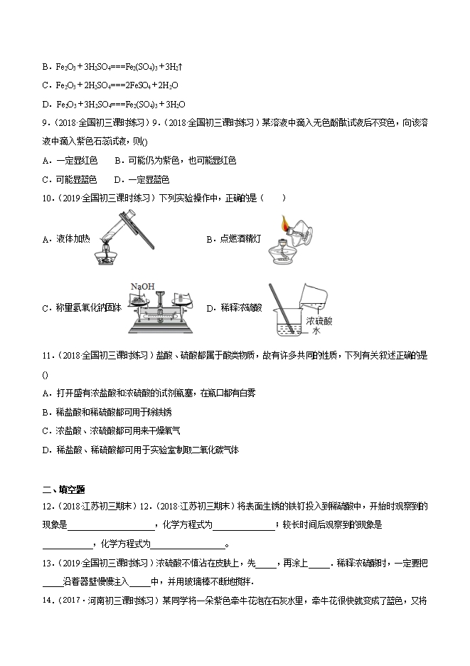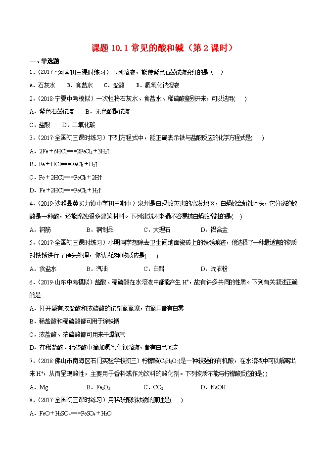 2019-2020学年人教版九年级化学下册《课题10.1常见的酸和碱(第2课时)》同步练习(原卷版)