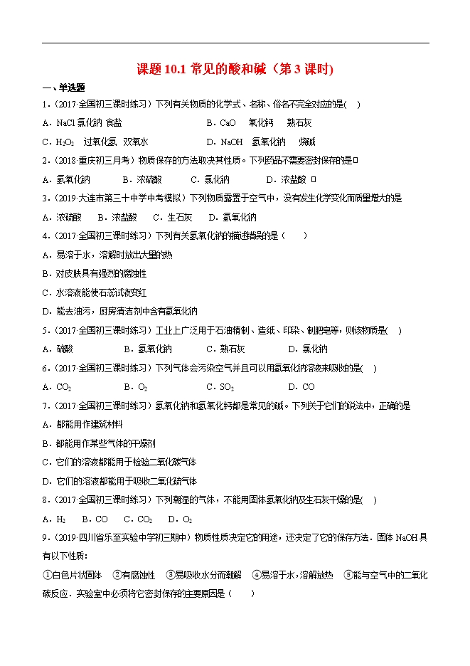 【内容简介】2019-2020学年人教版九年级化学下册《课题10.1常见的酸和碱(第3课时)》同步练习(原卷版)
