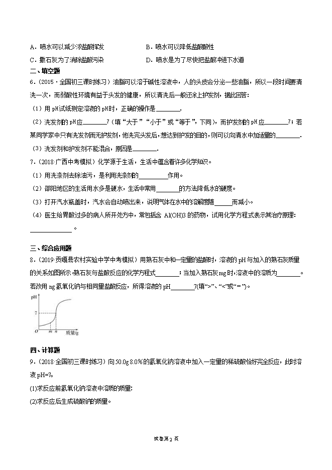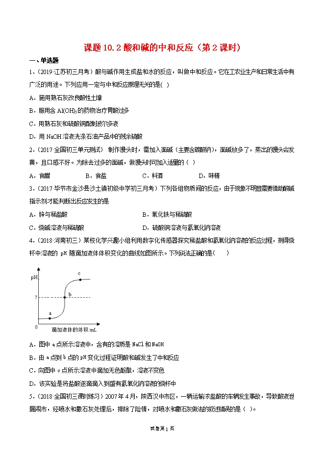 2019-2020学年人教版九年级化学下册《课题10.2 酸和碱的中和反应(第2课时)》同步练习(原卷版)