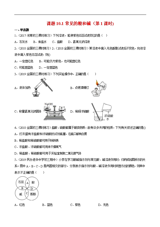 【内容简介】2019-2020学年人教版九年级化学下册《课题11.1生活中常见的盐(第1课时)》同步练习(原卷版)