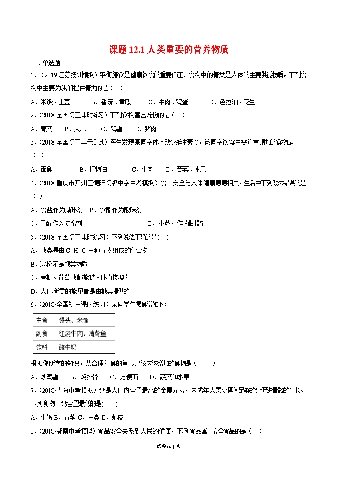 2019-2020学年人教版九年级化学下册《课题12.1 人类重要的营养物质》同步练习(原卷版)