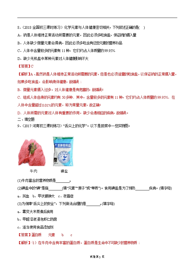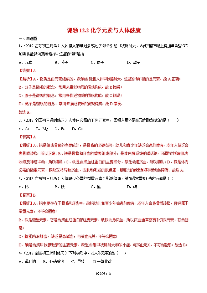 2019-2020学年人教版九年级化学下册《课题12.2 化学元素与人体健康》同步练习(解析版)