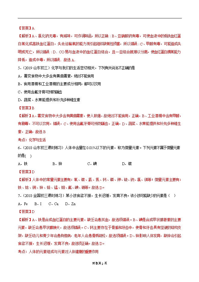 【内容简介】2019-2020学年人教版九年级化学下册《课题12.2化学元素与人体健康》同步练习(解析版)