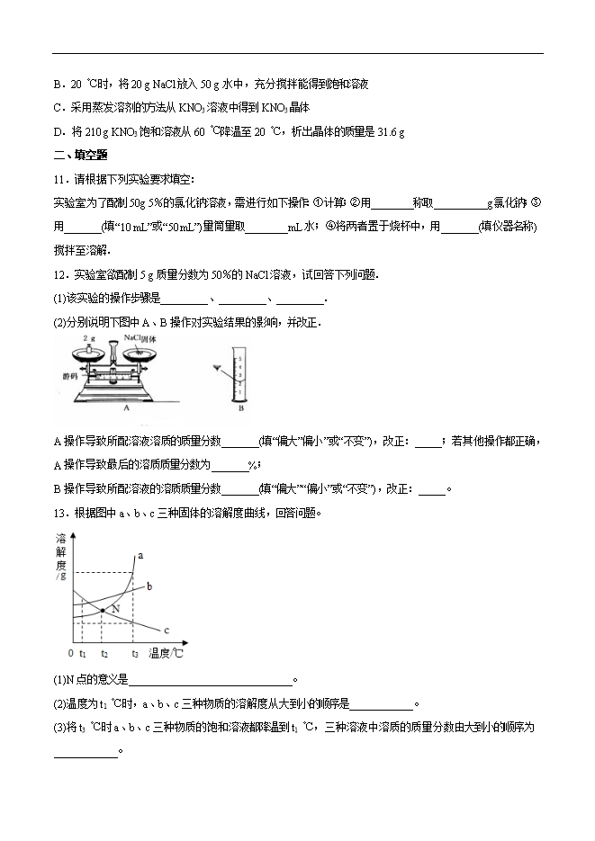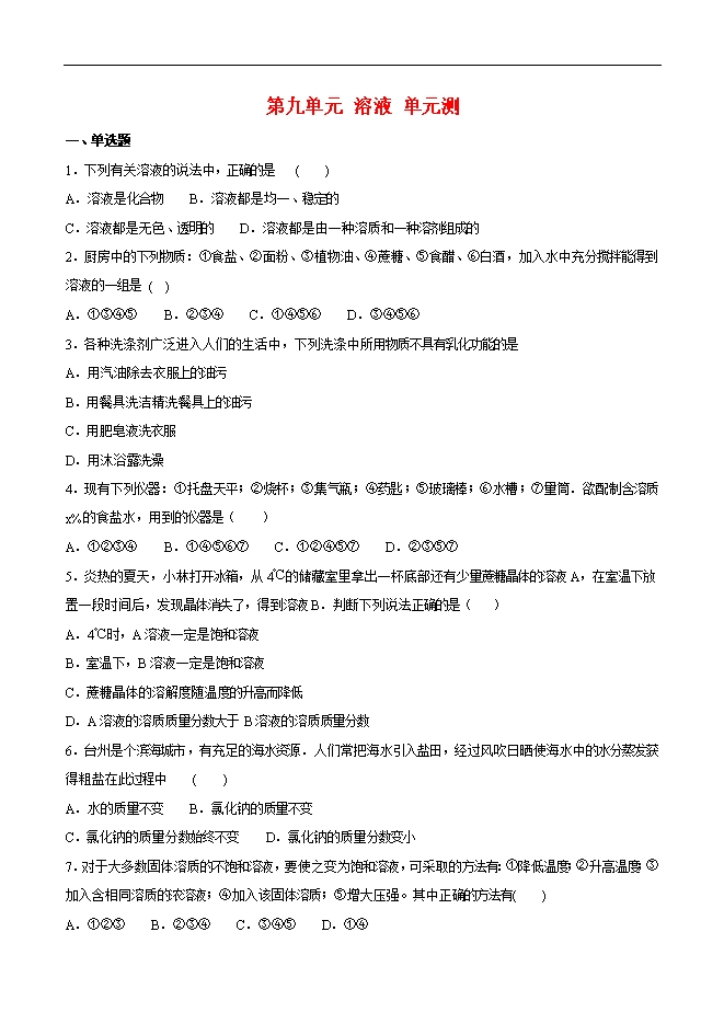 【内容简介】2019-2020学年人教版九年级化学下册《第九单元 溶液 》单元测试(原卷版)