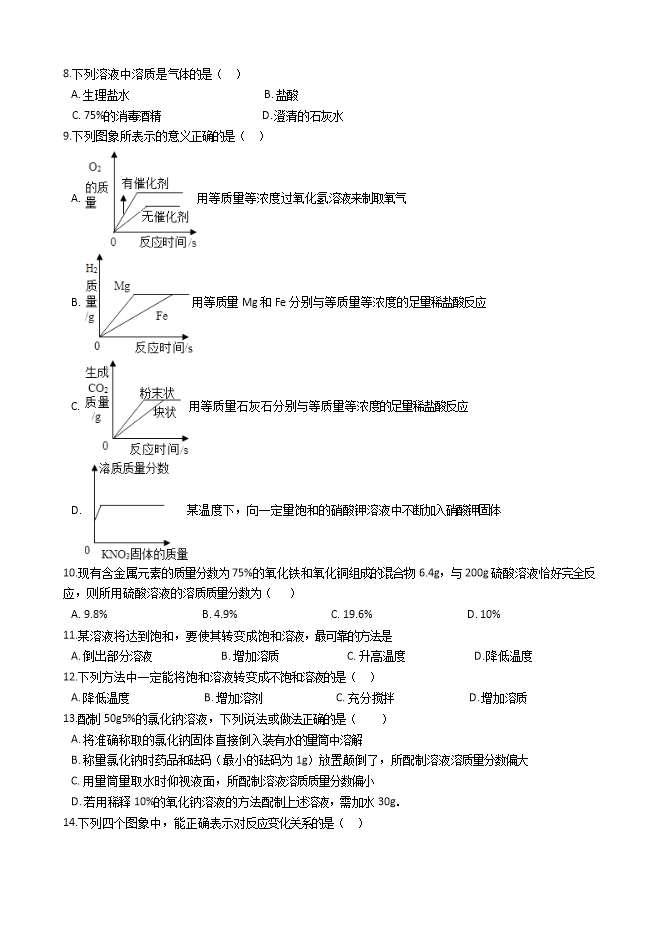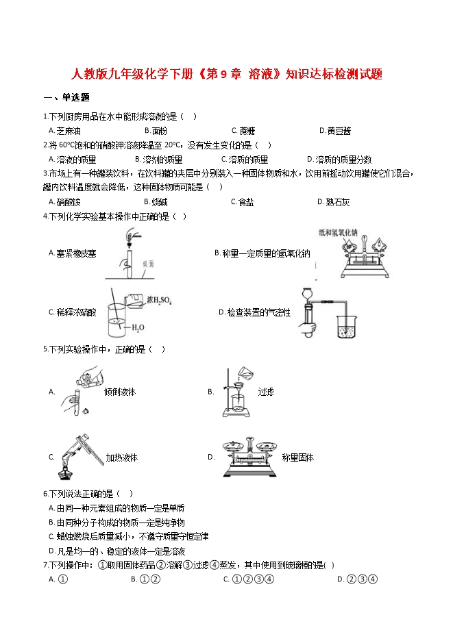 【内容简介】2019-2020学年人教版九年级化学下册《第九单元 溶液 》知识达标检测试题(word版含答案)