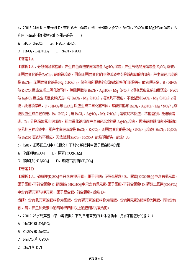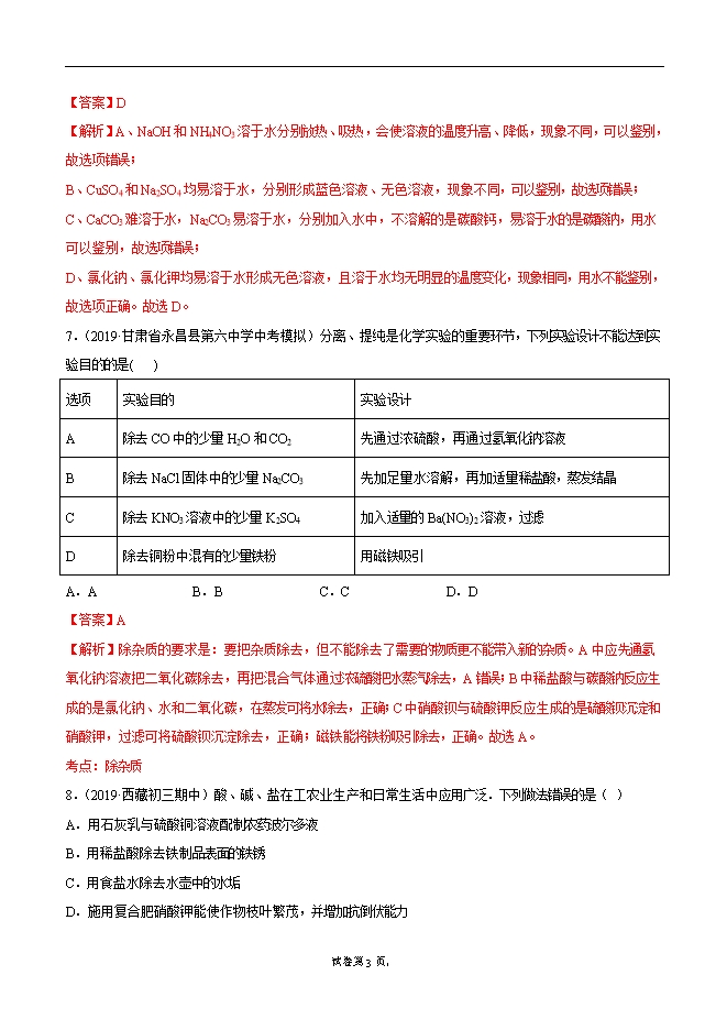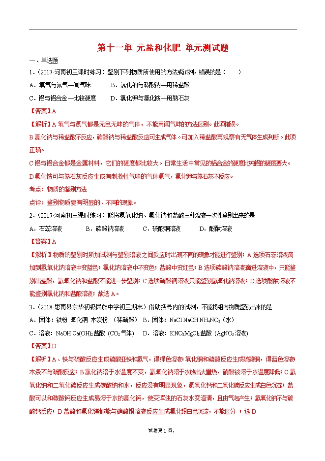 2019-2020学年人教版九年级化学下册《第十一单元 盐 化肥》单元测试(解析版)