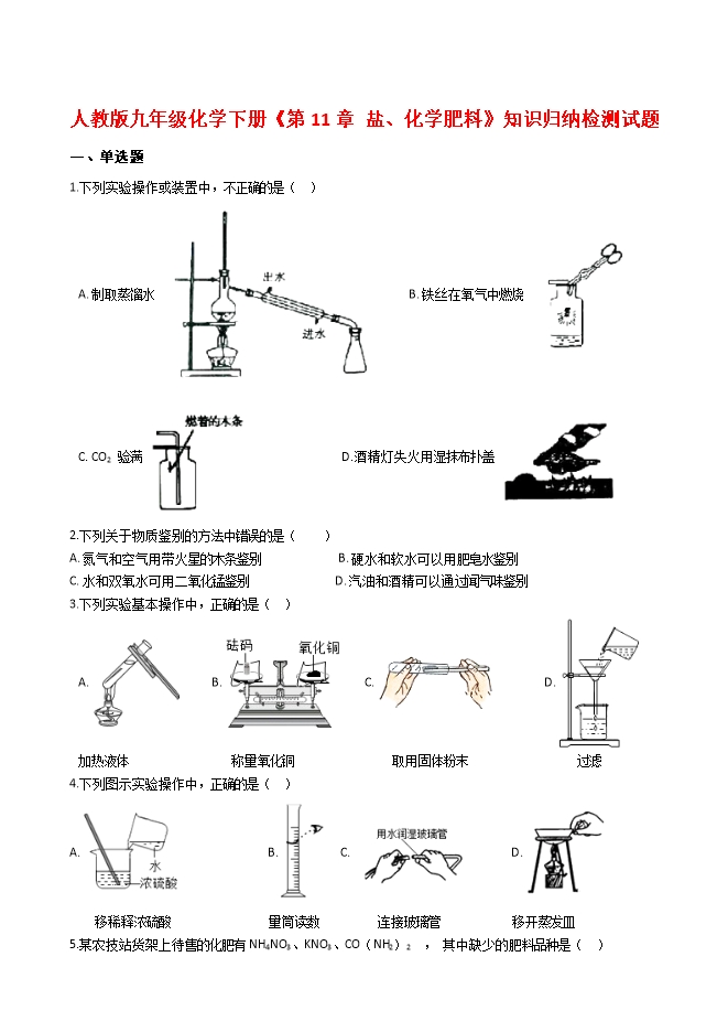 2019-2020学年人教版九年级化学下册《第十一单元 盐 化肥》知识归纳检测试题(word版含答案)