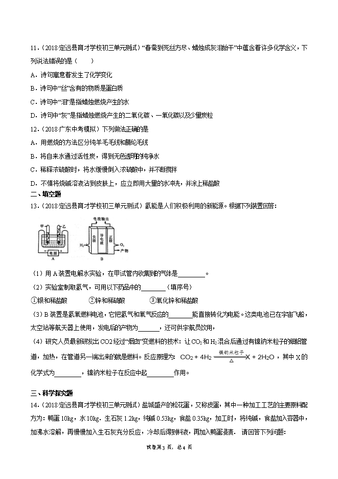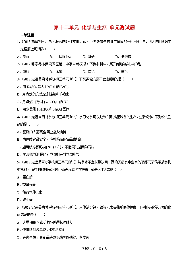 【内容简介】2019-2020学年人教版九年级化学下册《第十二单元化学与生活》单元测试(原卷版)