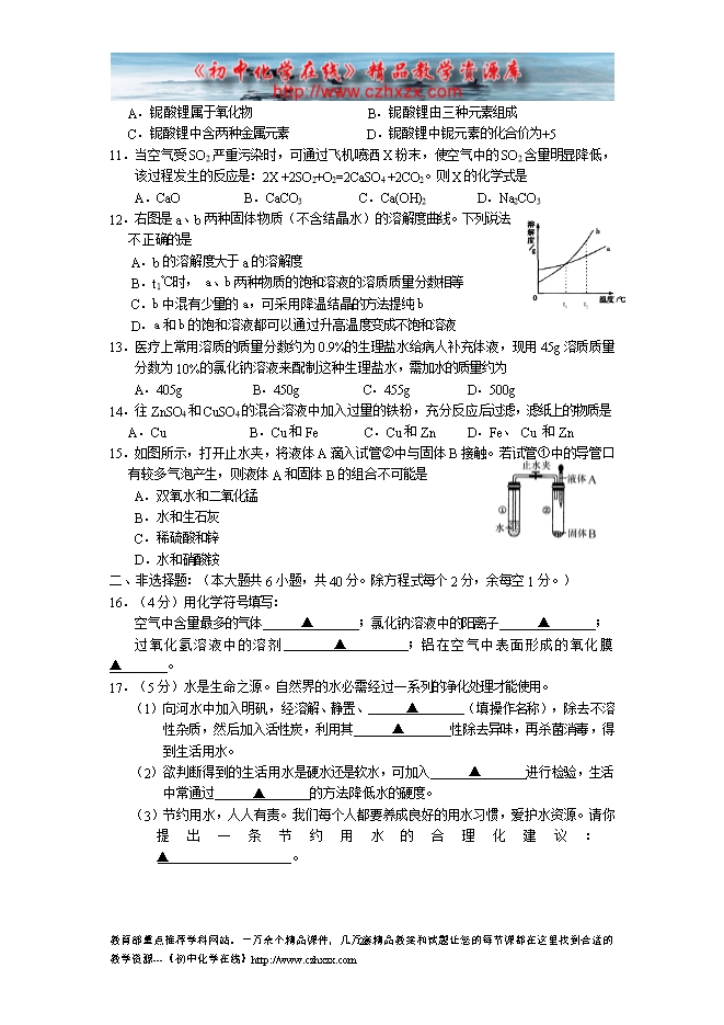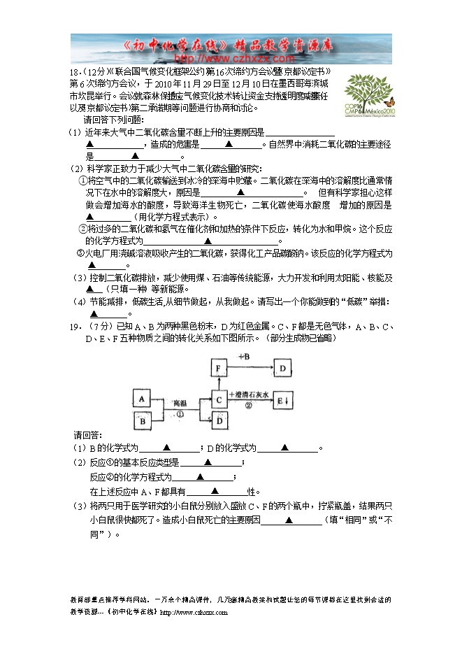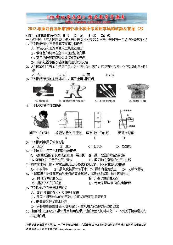 2012年浙江省温州市初中毕业学业考试化学模拟试题及答案(3)