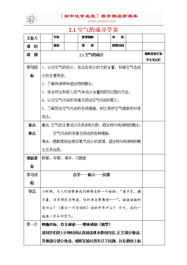 【内容简介】科粤版九年级化学上册《2.1空气的成分》同步学案(word版无答案)