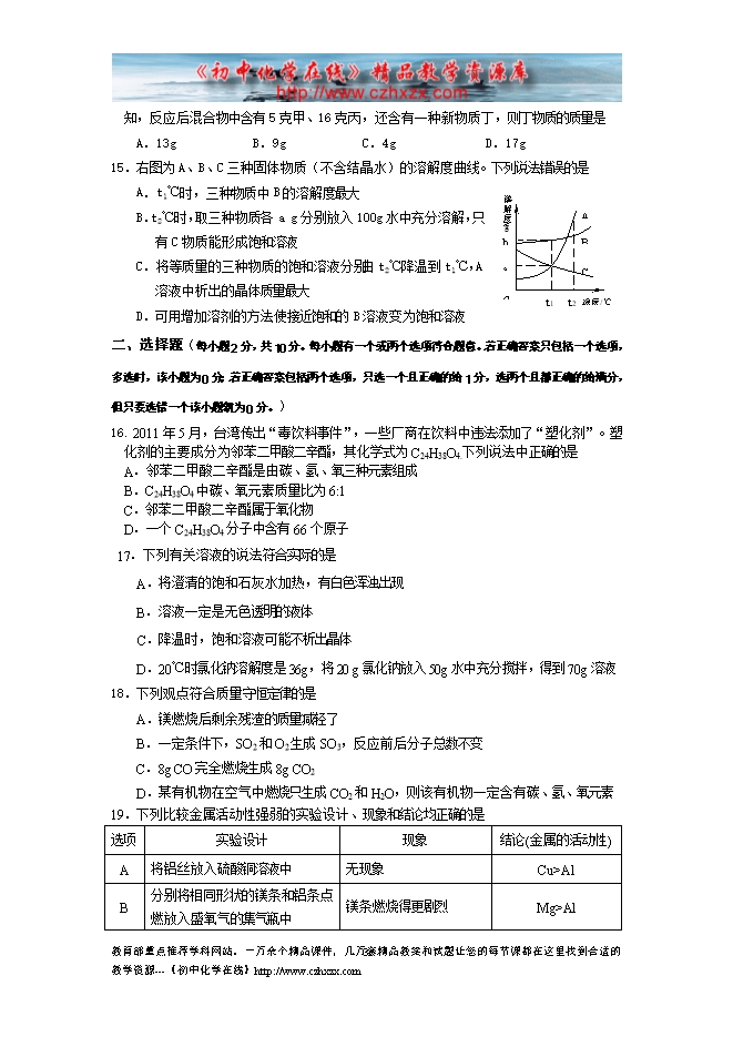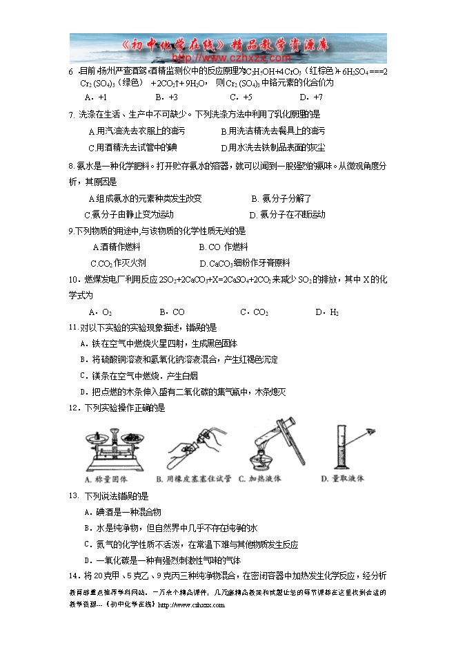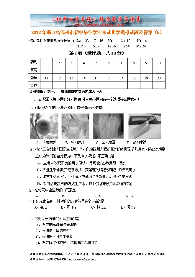 2012年浙江省温州市初中毕业学业考试化学模拟试题及答案(5)