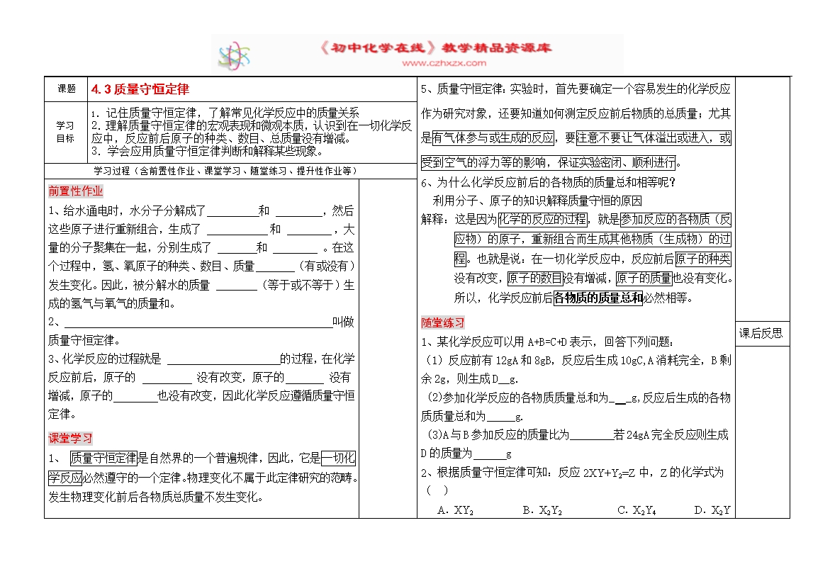 【内容简介】科粤版九年级化学上册《4.3质量守恒定律》同步学案(word版无答案)