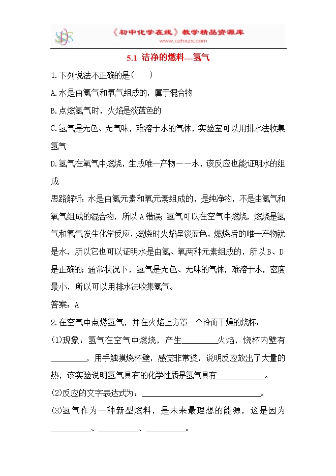 【内容简介】科粤版九年级化学上册《5.1洁净的燃料——氢气》同步学案(word版含答案解析)