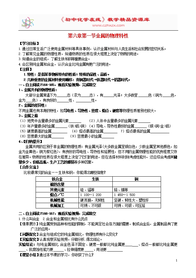 【内容简介】科粤版九年级化学下册《6.1金属材料的物理特性》同步学案(word版无答案)