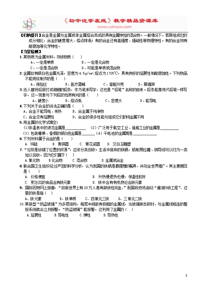 科粤版九年级化学下册《6.1金属材料的物理特性》同步学案(word版无答案)
