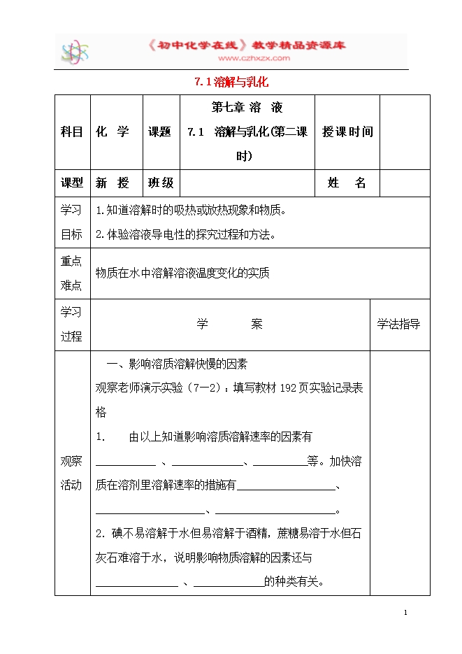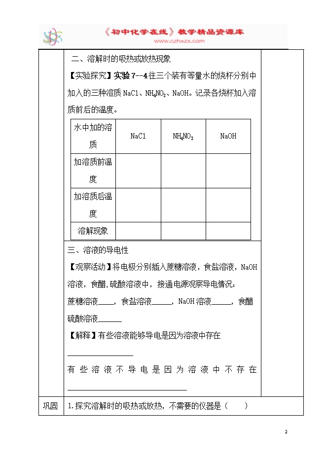 【内容简介】科粤版九年级化学下册《7.1溶解与乳化第2课时》同步学案(word版无答案)