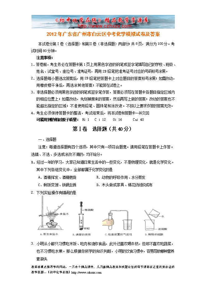 2012年广东省广州市白云区中考化学模拟试卷及答案