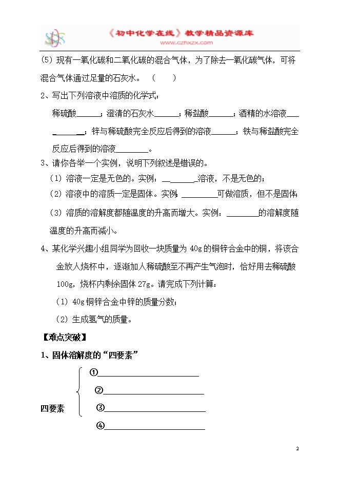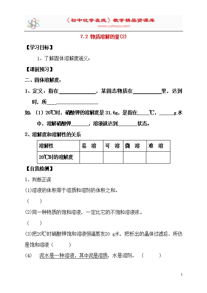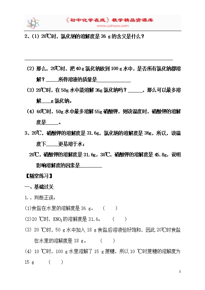 科粤版九年级化学下册《7.2 物质溶解的量第2课时》同步学案(word版无答案)