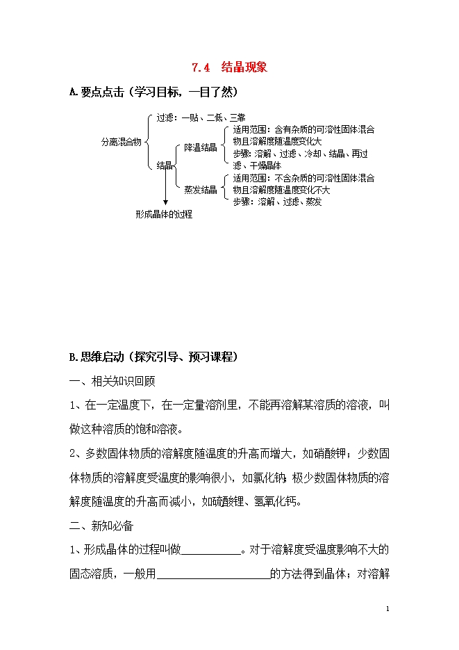 科粤版九年级化学下册《7.4 结晶现象》同步学案(word版无答案)
