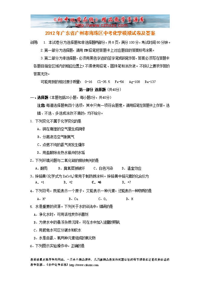 2012年广东省广州市海珠区中考化学模拟试卷及答案