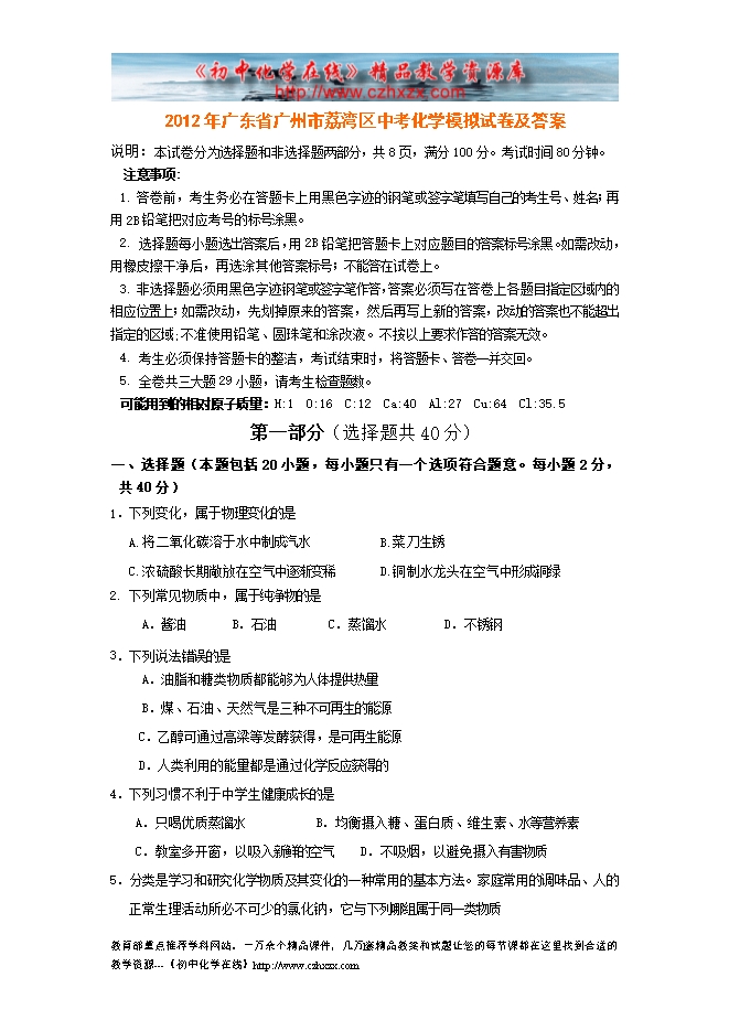 2012年广东省广州市荔湾区中考化学模拟试卷及答案