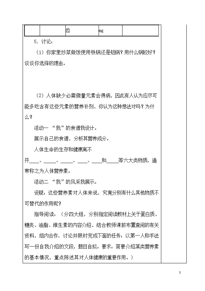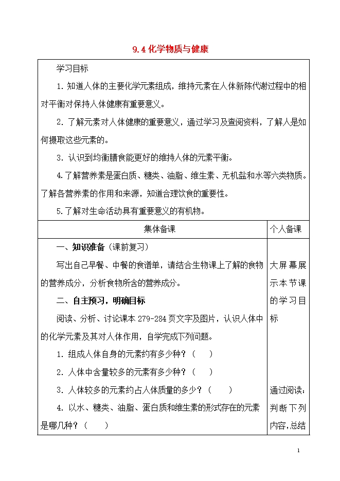 【内容简介】科粤版九年级化学下册《9.4化学物质与健康》同步导学案(word版无答案)