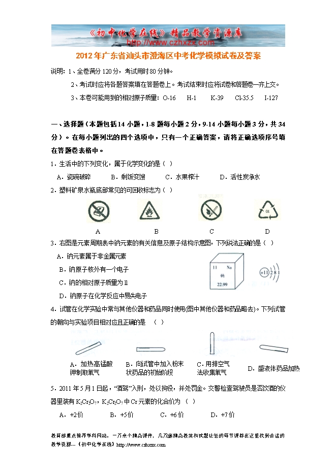 2012年广东省汕头市澄海区中考化学模拟试卷及答案