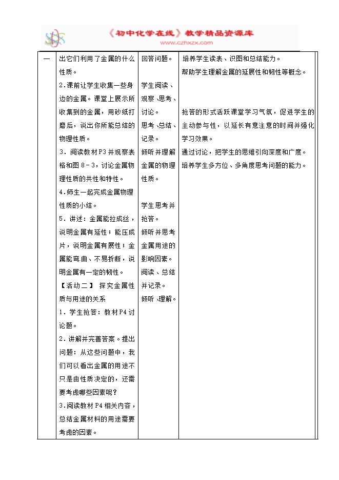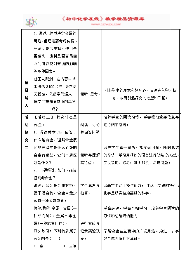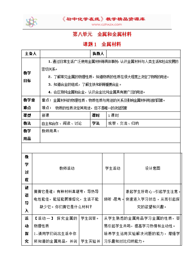 2020年春人教版九年级化学下册《课题8.1金属材料》教学设计