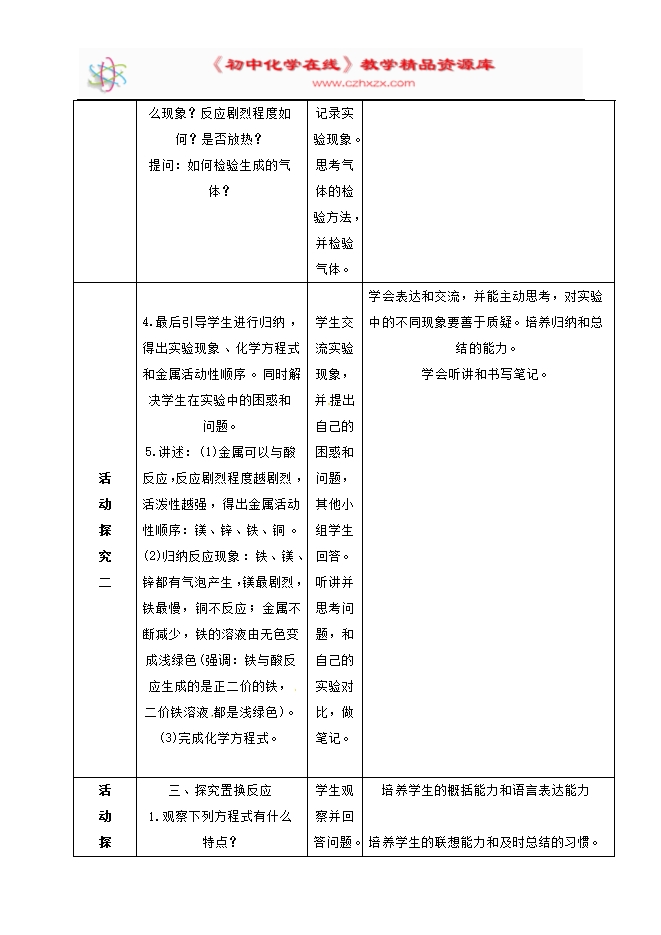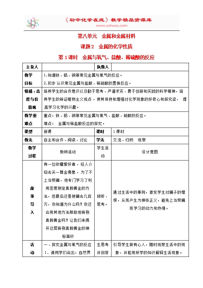 2020年春人教版九年级化学下册《课题8.2 金属的化学性质(第1课时)》教学设计