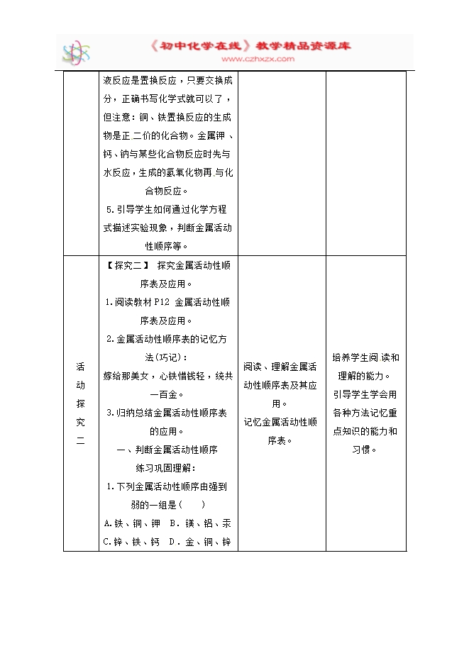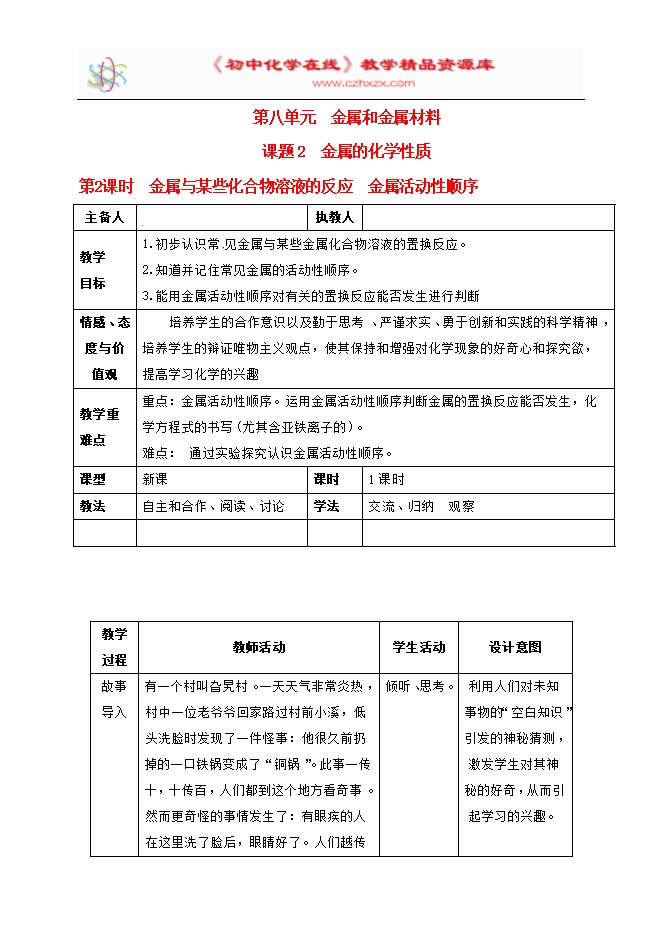 【内容简介】2020年春人教版九年级化学下册《课题8.2金属的化学性质(第2课时)》教学设计