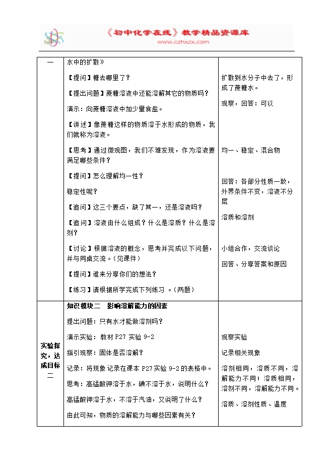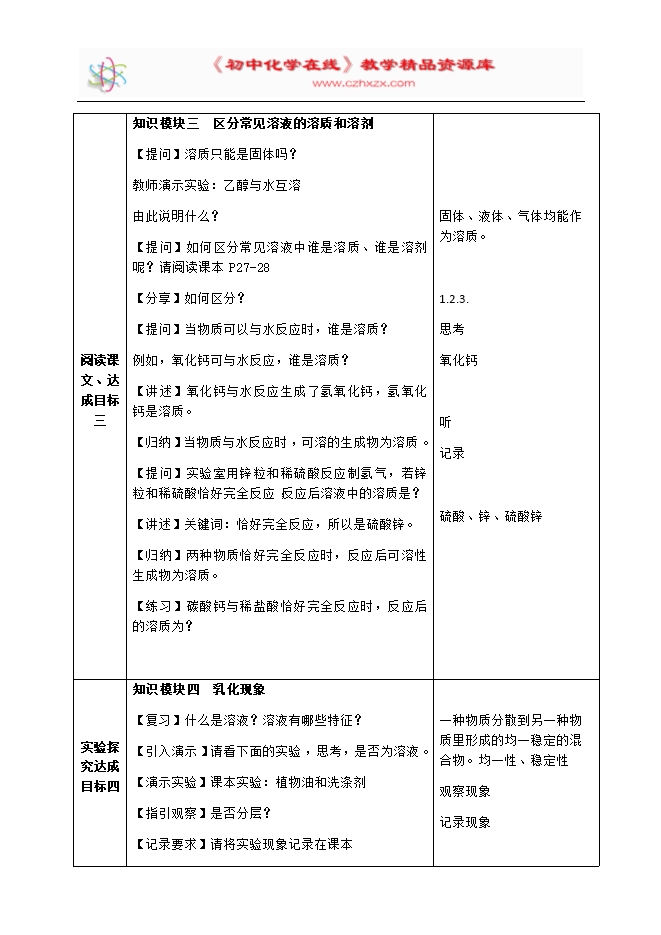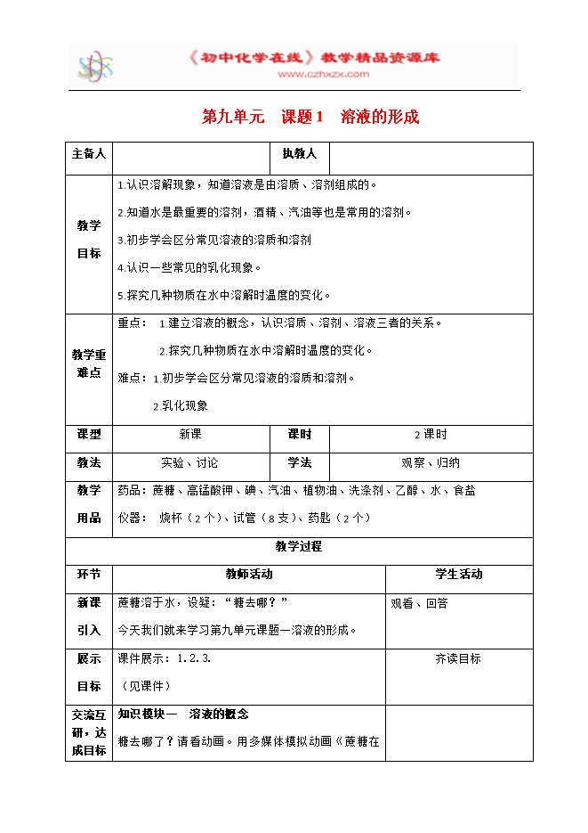 【内容简介】2020年春人教版九年级化学下册《课题9.1溶液的形成》教学设计9.1溶液的形成