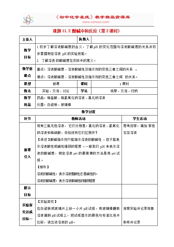 2020年春人教版九年级化学下册《课题10.2酸和碱的中和反应(第2课时)》教学设计