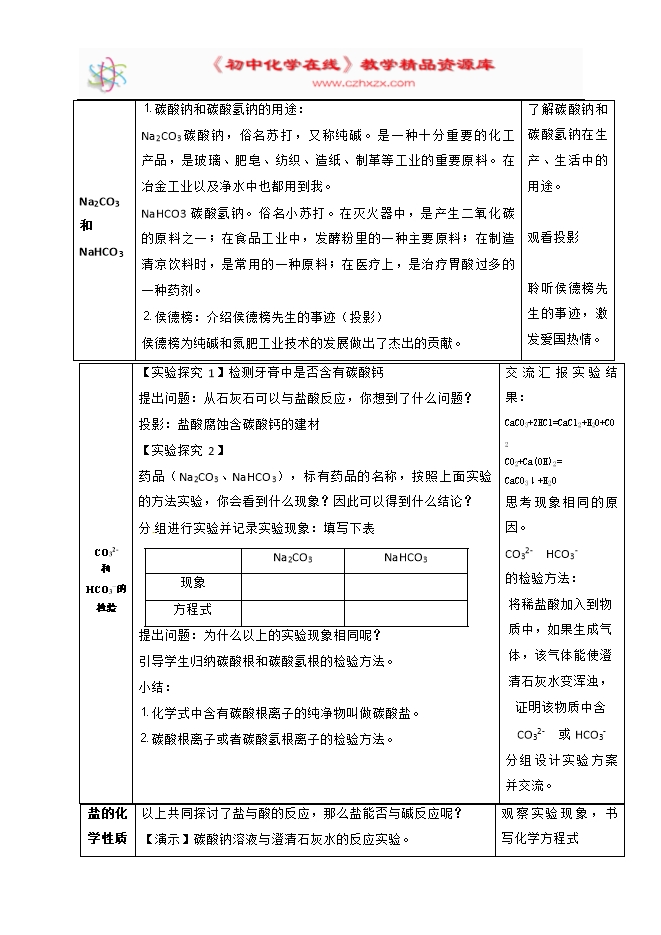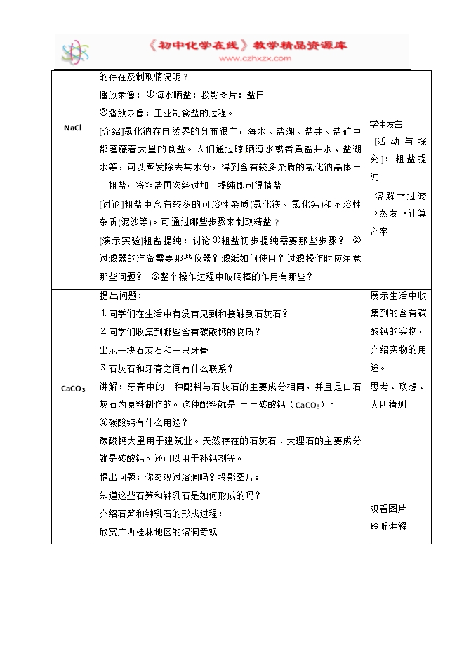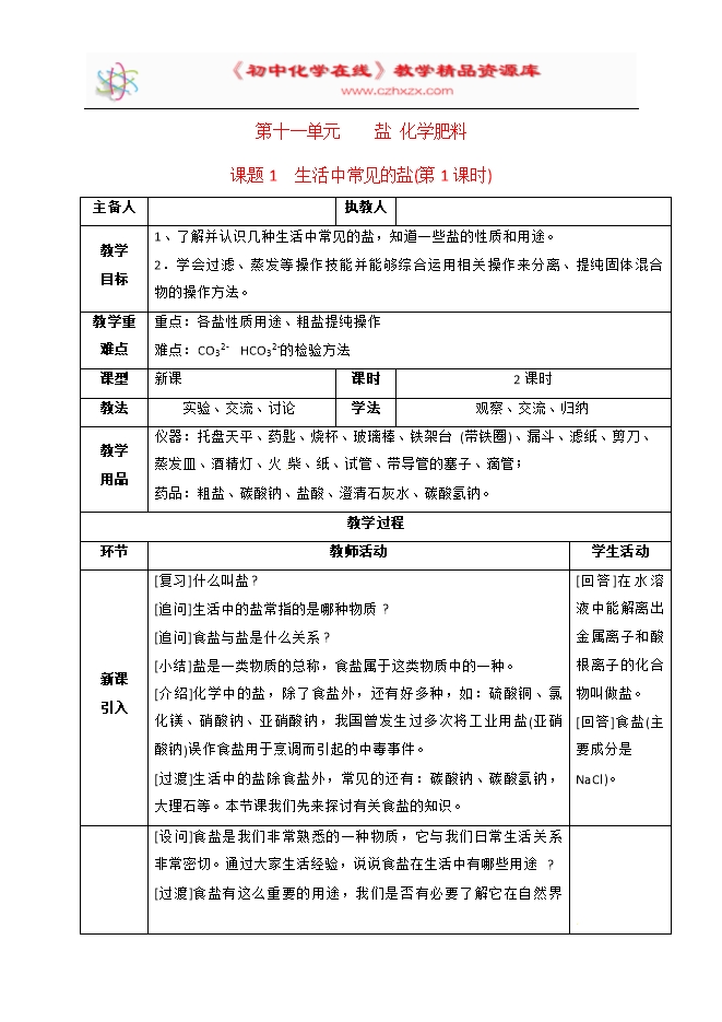 【内容简介】2020年春人教版九年级化学下册《课题11.1生活中常见的盐(第1课时)》教学设计