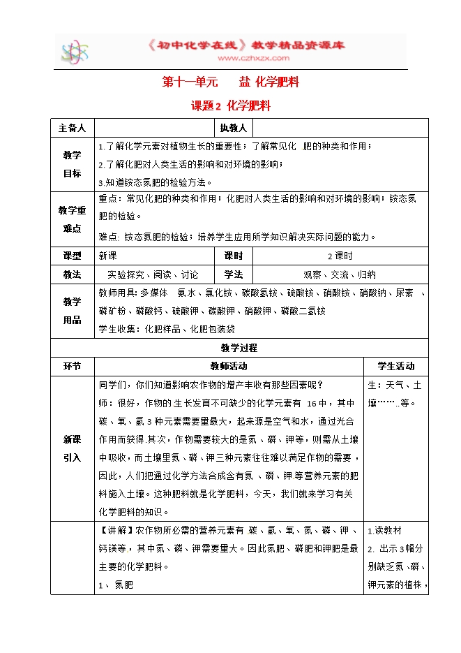 2020年春人教版九年级化学下册《课题11.2 化学肥料》教学设计