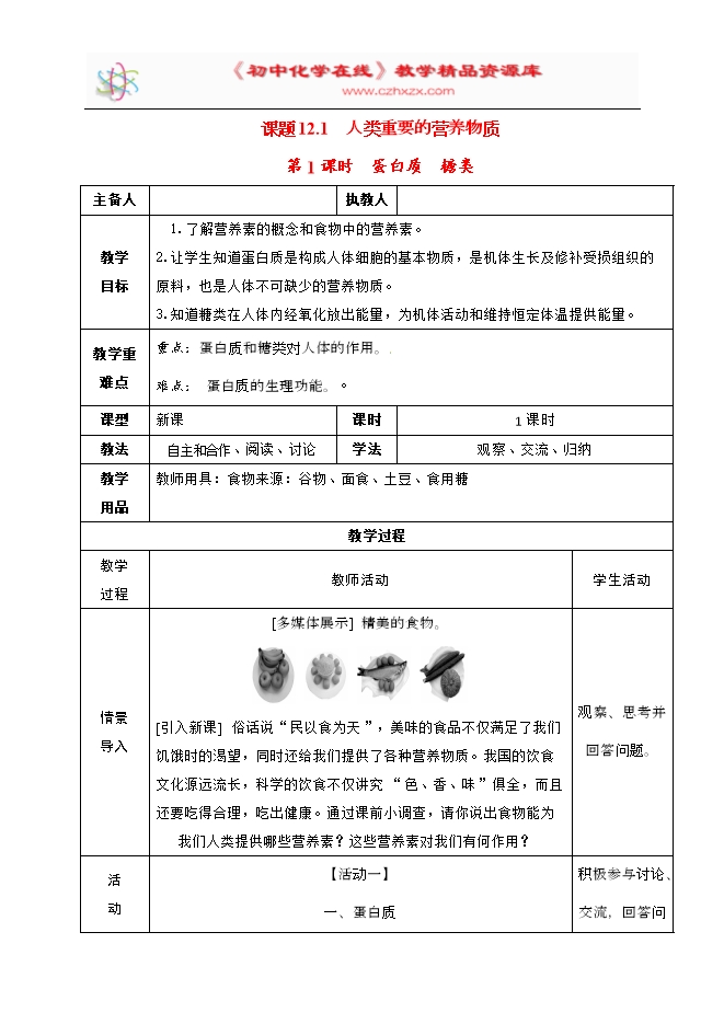 【内容简介】2020年春人教版九年级化学下册《课题12.1人类重要的营养物质(第1课时)》教学设计
