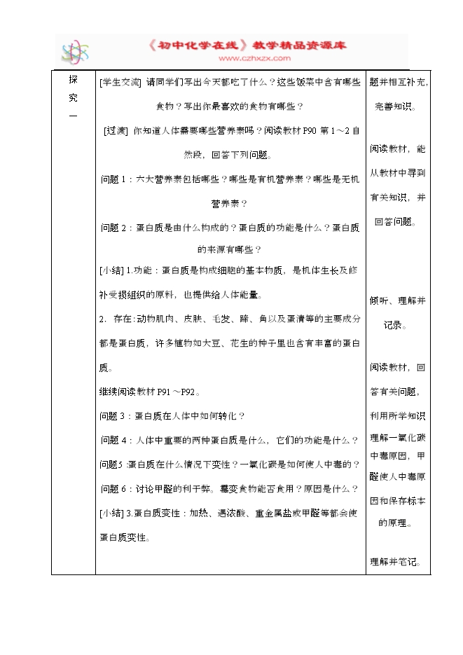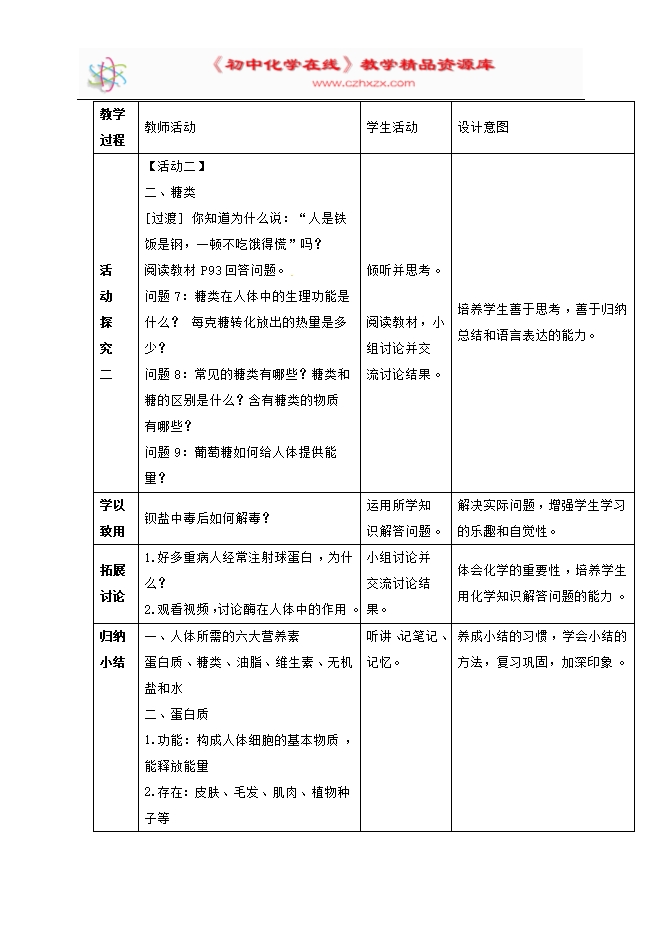 2020年春人教版九年级化学下册《课题12.1 人类重要的营养物质(第1课时)》教学设计