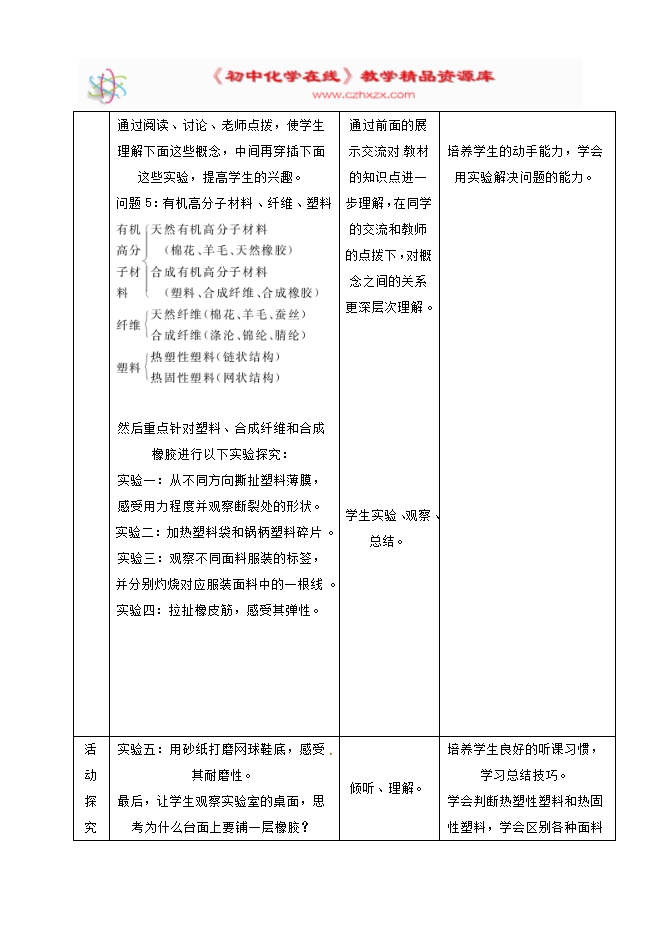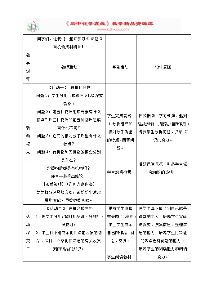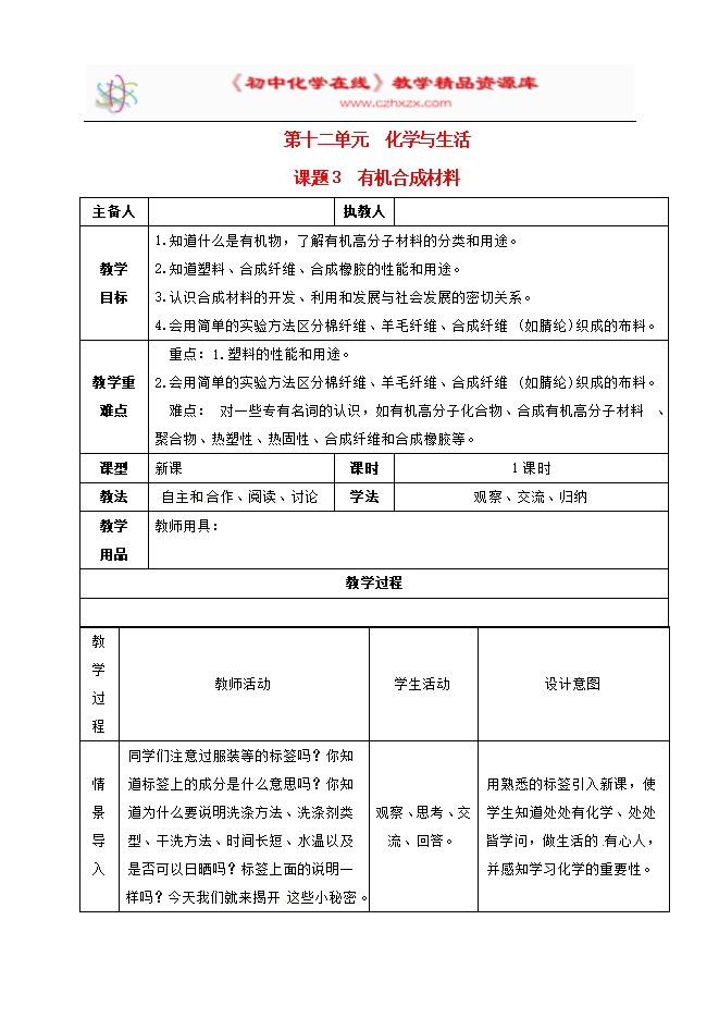 2020年春人教版九年级化学下册《课题12.3 有机合成材料》教学设计
