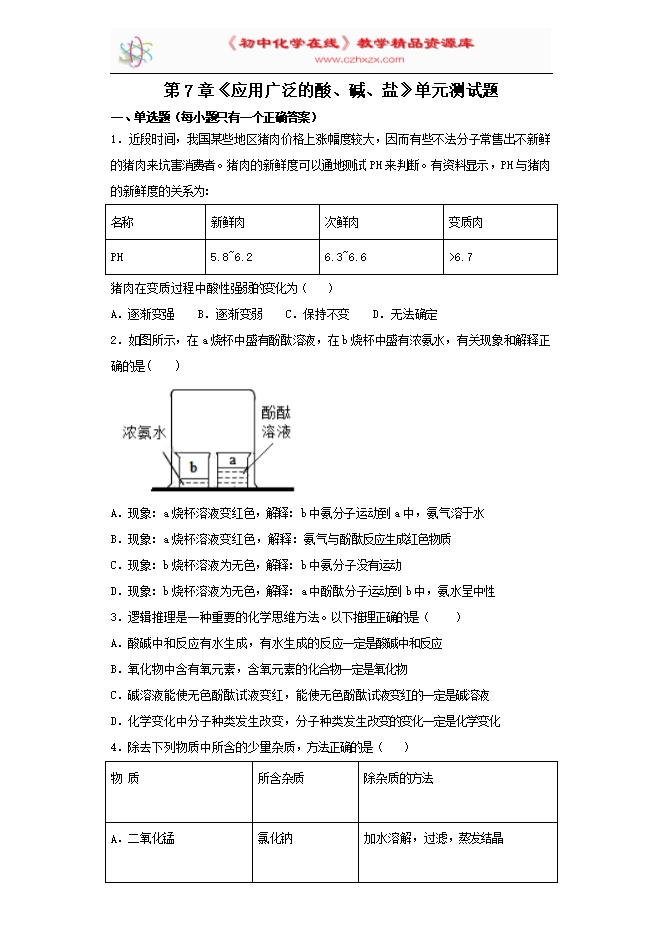 【内容简介】沪教版初中化学九年级下册《第7章 应用广泛的酸、碱、盐》单元测试题(word版含答案解析)