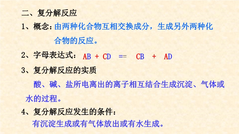 【内容简介】概念 :由两种化合物互相交换成分,生成另外两种化合物的反应 复分解反应的实质 ; 酸、碱、盐所电离出的离子相互结合生成沉淀、气体或水的过程。复分解反应发生的条件:有沉淀生成或有气体放出或有水生成。.....