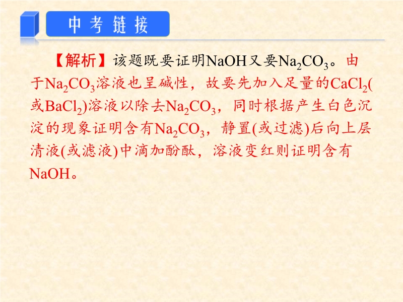 【内容简介】该题既要证明NaOH又要Na2CO3。由于Na2CO3溶液也呈碱性,故要先加入足量的CaCl2(或BaCl2)溶液以除去Na2CO3,同时根据产生白色沉淀的现象证明含有Na2CO3,静置(或过滤)后向上层清液(或滤液)中滴加酚酞,溶液变红则证明含有NaOH。取少量A装置中的溶液,加入足量CaCl2溶液(或BaCl2溶液等),静置,取上层清液,向其中滴加几滴酚酞溶液。若溶液变成红色,则溶质为Na2CO3和NaOH;若溶液没有变成红色,则溶质为Na2CO3。