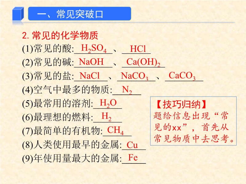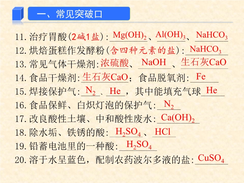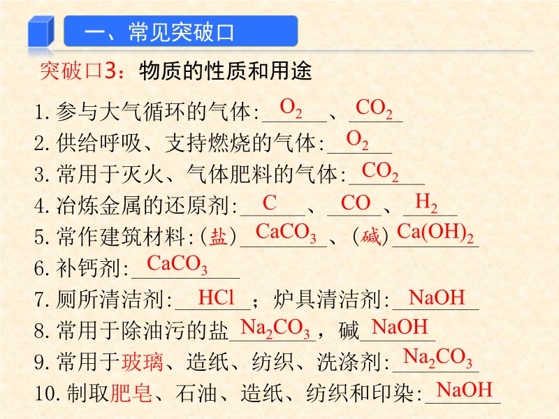【内容简介】1.参与大气循环的气体:______、_____2.供给呼吸、支持燃烧的气体:______3.常用于灭火、气体肥料的气体:_______4.冶炼金属的还原剂:______、_____、_____5.常作建筑材料:(盐)________、(碱)________6.补钙剂:__________7.厕所清洁剂:_______;炉具清洁剂:________8.常用于除油污的盐________,碱_______9.常用于玻璃、造纸、纺织、洗涤剂:________10.制取肥皂、石油、造纸、纺织和印染:_______