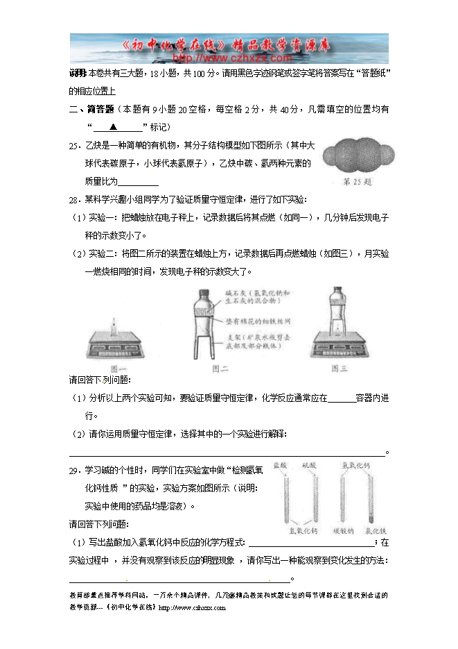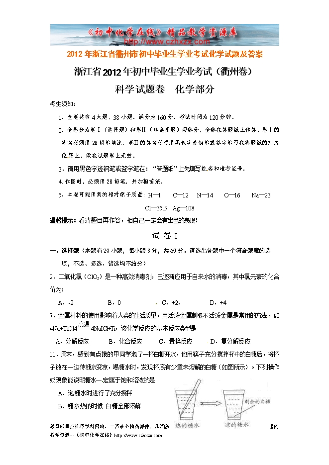2012年浙江省衢州市初中毕业生学业考试化学试题及答案