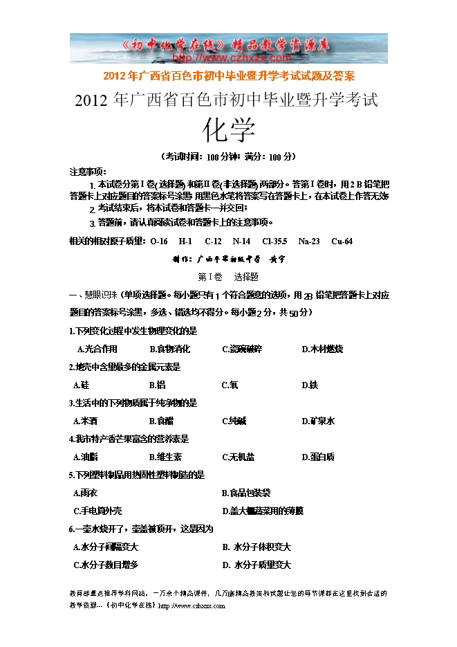 2012年广西省百色市初中毕业暨升学考试试题及答案