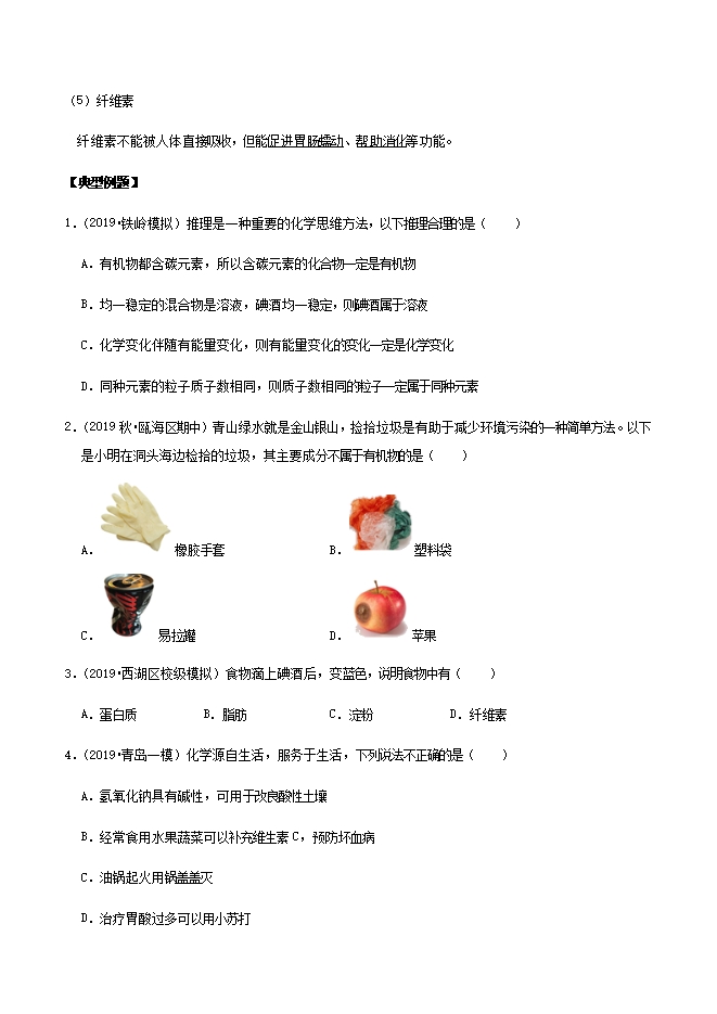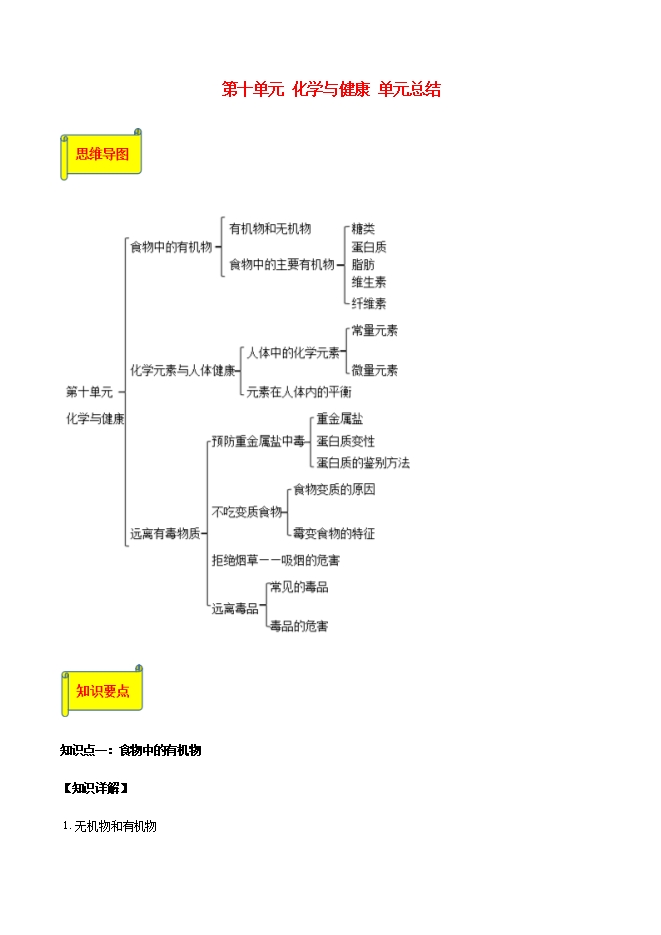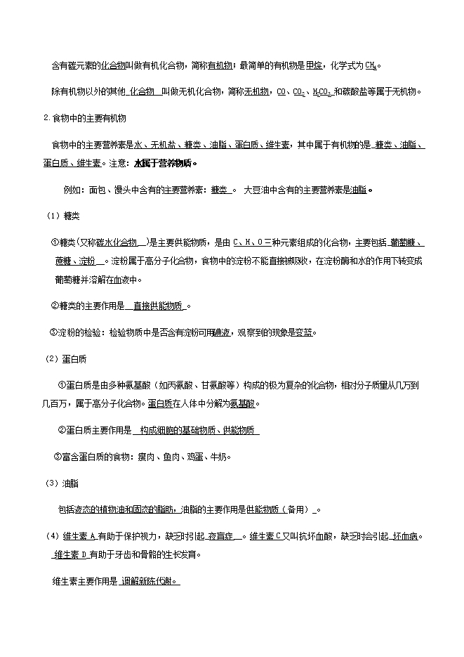 【内容简介】【知识详解】1.无机物和有机物含有碳元素的化合物叫做有机化合物,简称有机物;最简单的有机物是甲烷,化学式为CH4。除有机物以外的其他_化合物__叫做无机化合物,简称无机物,CO、CO2、H2CO3_和碳酸盐等属于无机物。2.食物中的主要有机物食物中的主要营养素是水、无机盐、糖类、油脂、蛋白质、维生素,其中属于有机物的是_糖类、油脂、蛋白质、维生素。注意:水属于营养物质。例如:面包、馒头中含有的主要营养素:糖类 。 大豆油中含有的主要营养素是油脂。(1)糖类①糖类(又称碳水化合物__)是主要供能物质,是由C、H、O三种元素组成的化合物,主要包括_葡萄糖、蔗糖、淀粉__。淀粉属于高分子化合物,食物中的淀粉不能直接被吸收,在淀粉酶和水的作用下转变成葡萄糖并溶解在血液中。②糖类的主要作用是__直接供能物质_。③淀粉的检验:检验物质中是否含有淀粉可用碘液,观察到的现象是变蓝。(2)蛋白质①蛋白质是由多种氨基酸(如丙氨酸、甘氨酸等)构成的极为复杂的化合物,相对分子质量从几万到几百万,属于高分子化合物。蛋白质在人体中分解为氨基酸。②蛋白质主要作用是 构成细胞的基础物质、供能物质 ③富含蛋白质的食物:瘦肉、鱼肉、鸡蛋、牛奶。(3)油脂