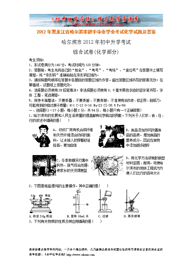 2012年黑龙江省哈尔滨市初中毕业学业考试化学试题及答案