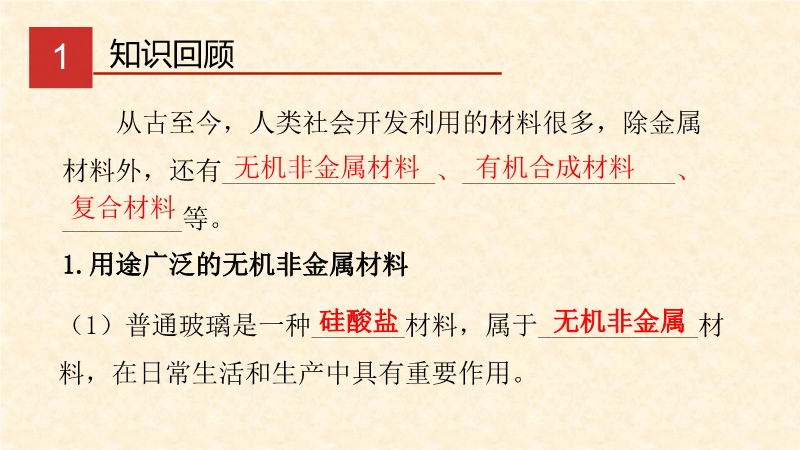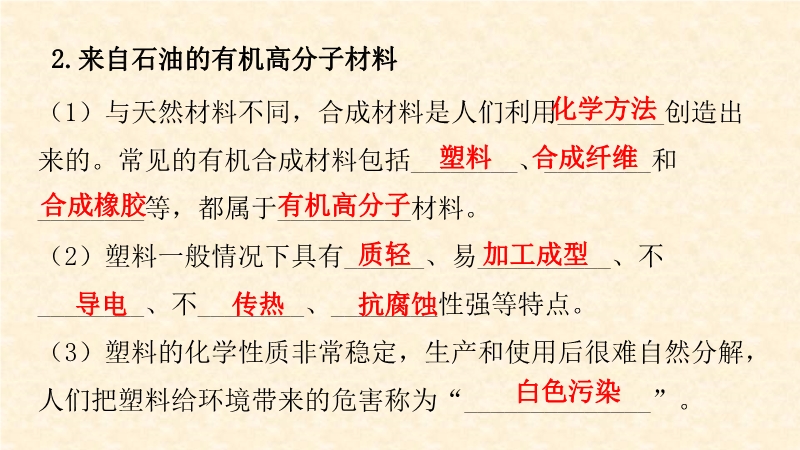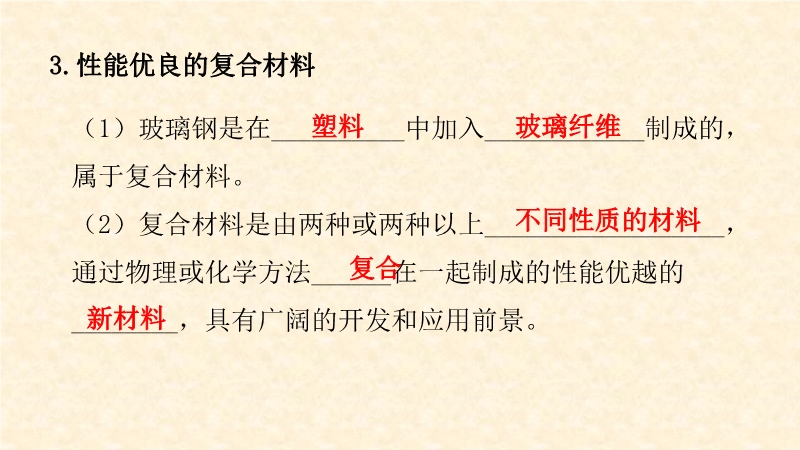 【内容简介】从古至今,人类社会开发利用的材料很多,除金属材料外,还有________________、________________、_________等1)与天然材料不同,合成材料是人们利用________创造出来的。常见的有机合成材料包括________、________和________等,都属于__________材料。(2)塑料一般情况下具有______、易__________、不________、不________、________性强等特点。(3)塑料的化学性质非常稳定,生产和使用后很难自然分解,人们把塑料给环境带来的危害称为“______________”(1)玻璃钢是在__________中加入____________制成的,属于复合材料。(2)复合材料是由两种或两种以上__________________,通过物理或化学方法______在一起制成的性能优越的________,具有广阔的开发和应用前景。