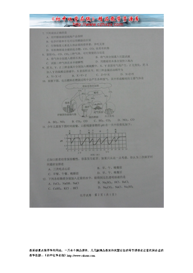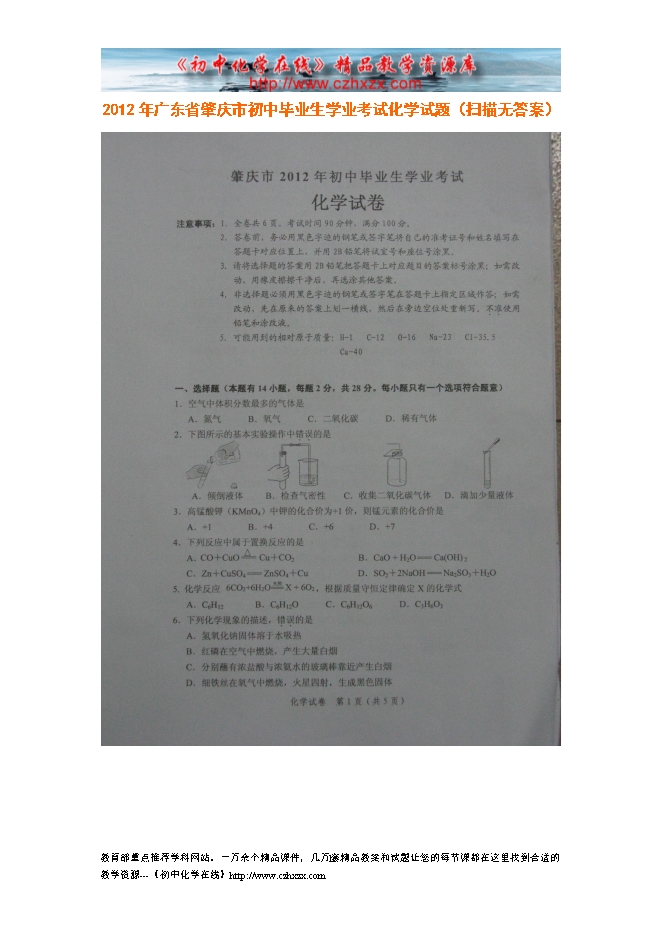 2012年广东省肇庆市初中毕业生学业考试化学试题(扫描无答案)