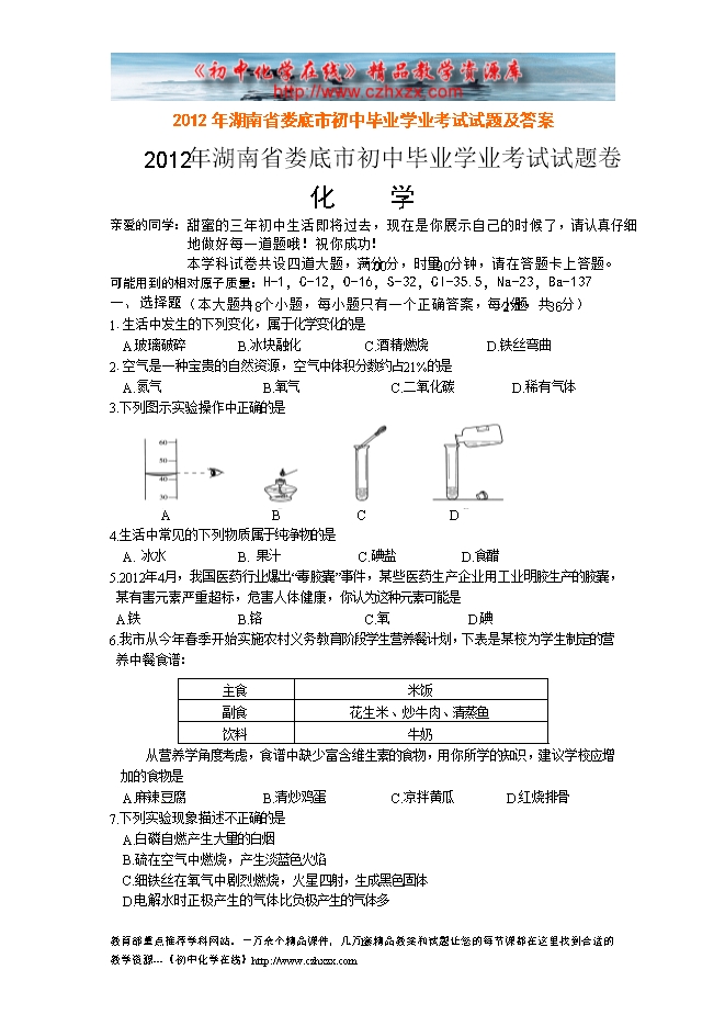 2012年湖南省娄底市初中毕业学业考试试题及答案