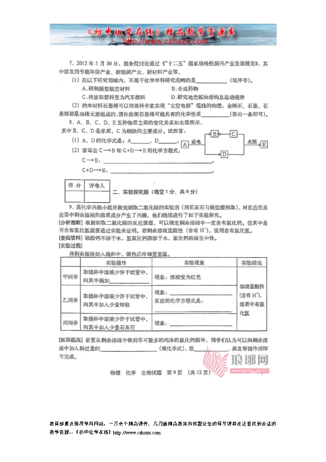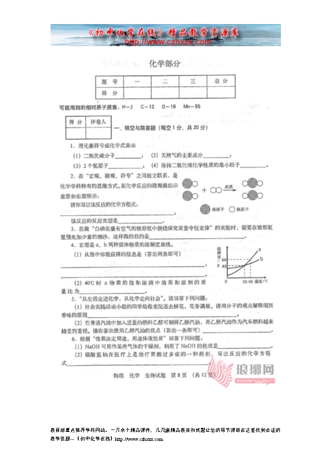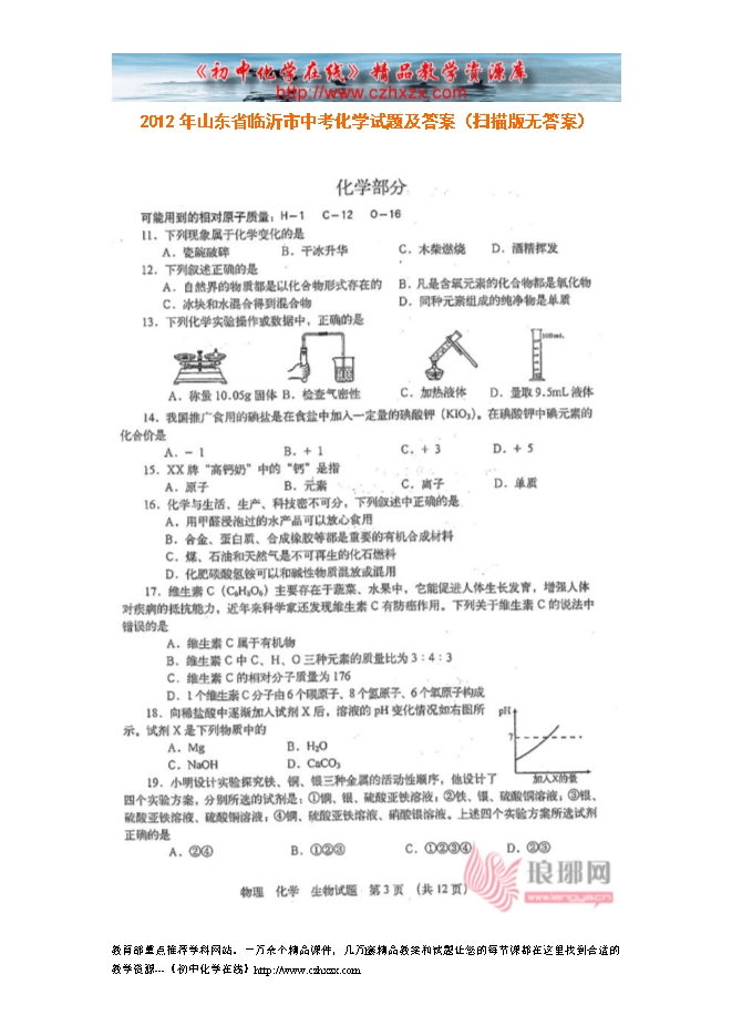 2012年山东省临沂市中考化学试题及答案(扫描版无答案)